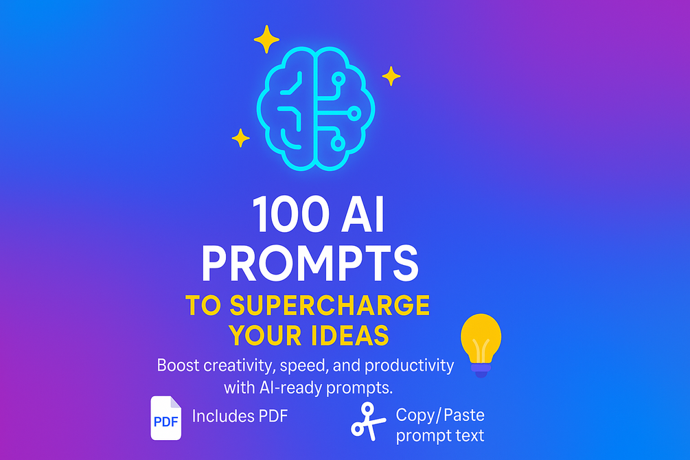 100 AI Prompts to Supercharge Your Ideas. “Get started with powerful, ready-to-use prompts for creators, solopreneurs, and innovators.”